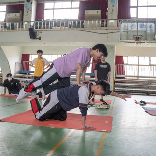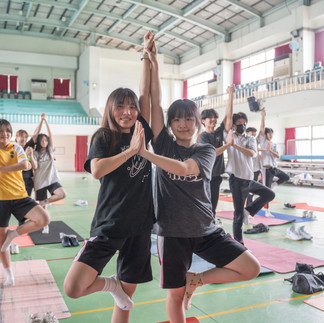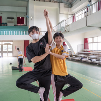 第二階段移師活動中心,唐老師引導學生從躺姿的舒緩動作開始暖身,逐步進入流暢的後彎序列。課程尾聲更設計趣味環節,學生兩兩一組嘗試「雙人瑜珈」與「手平衡支撐」,笑聲與驚嘆聲不斷。