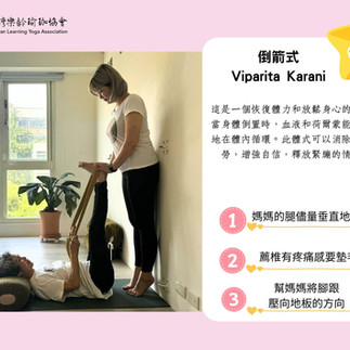 這是一個溫和的前伸展體式。膝蓋和小腿下方放抱枕支撐可以避免膝蓋的壓力,用瑜珈繩幫助媽媽穩定骨盆將身體向前伸展,脊椎和軀幹可以得到很好的被動拉伸。媽媽可以感覺到背部肌肉放鬆、柔軟時,軀幹是如何被伸展的。